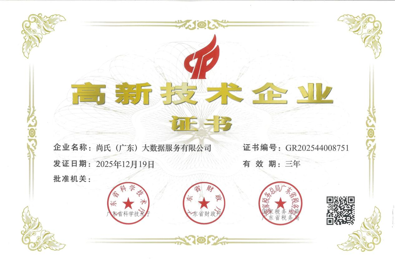 继2022年首次获得国家高新技术企业认定后,尚氏(广东)大数据服务有限公司于2025年再次通过认定,并于20251219日取得由广东省科学技术厅、广东省财政厅、国家税务总局广东省税务局联合颁发的《国家高新技术企业证书》。