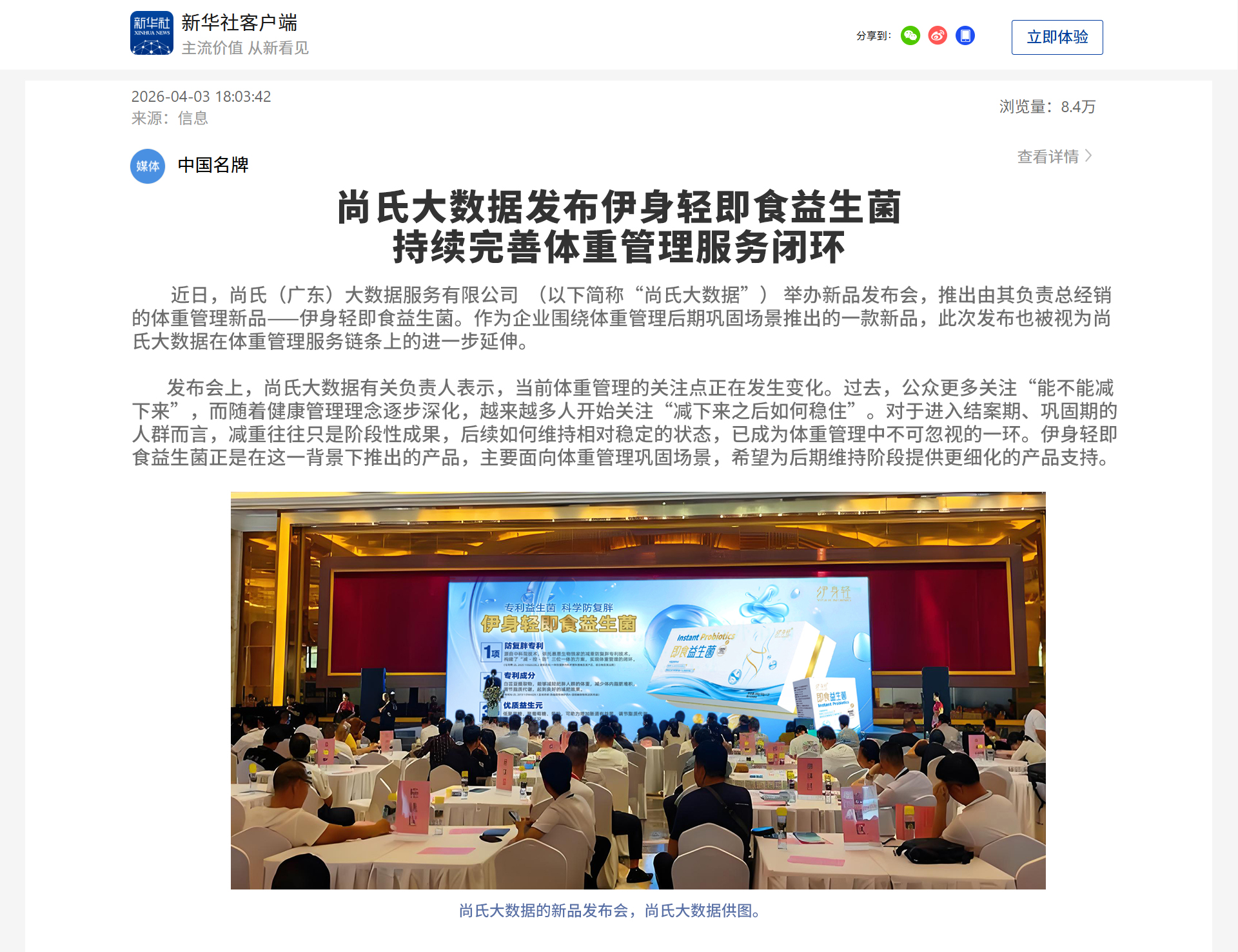 此前,新华社相关报道已对尚氏大数据新品发布会进行报道,明确提到:尚氏(广东)大数据服务有限公司正式推出体重管理新品——伊身轻即食益生菌,并指出这款产品主要聚焦体重管理后期的巩固场景,是企业围绕“减下来之后如何稳住”这一现实需求推出的重要新品。